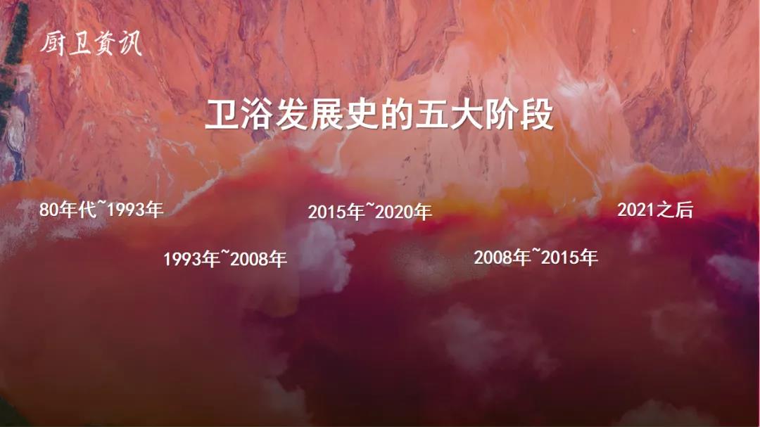 做2022年衛(wèi)浴發(fā)展趨勢分析前,回顧和梳理衛(wèi)浴發(fā)展史是非常有必要的。我國衛(wèi)浴的發(fā)展史大體可以分為五個階段,第一個階段是80年代到1993年,第二個階段是1993年~2008年,第三個階段是2008年~2015年,第四個階段是2015年到2020年,第五個發(fā)展階段便是2021年往后的時期。