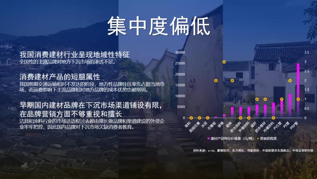 這是中信證券的一份研報,據(jù)該研報顯示,品牌建材在下沉市場仍具有巨大滲透空間。過去我們的家居行業(yè)頭部品牌均把精力放在了一、二線城市的市場競爭,同時因為建材行業(yè)物流的“短腿屬性”,對下沉渠道的滲透力是不夠的。