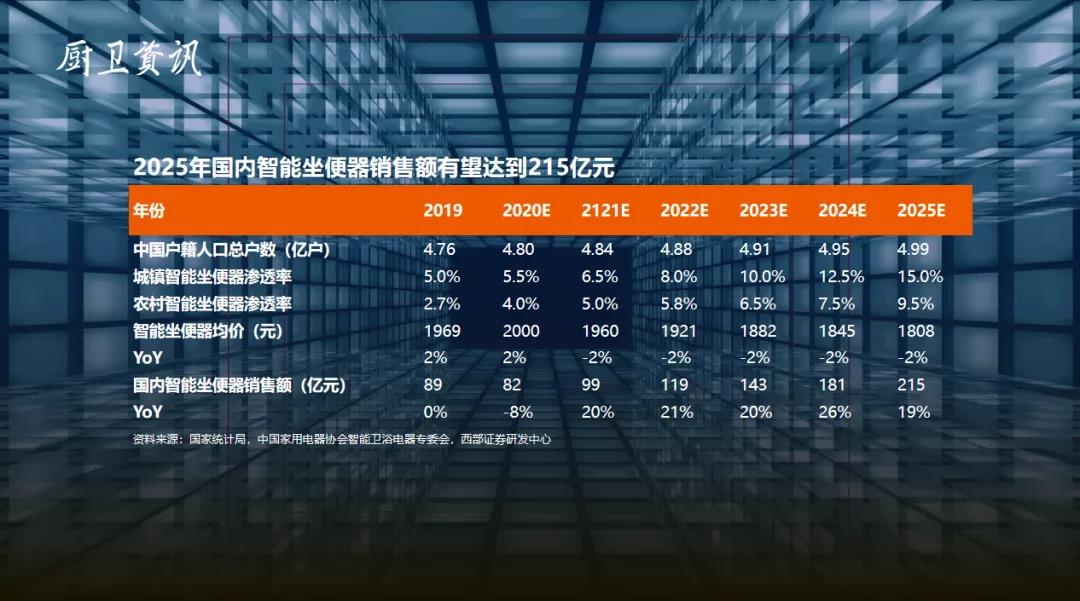 以智能馬桶為例,這組數(shù)據(jù)顯示,到2025年,我們中國智能馬桶銷售額有望達到215億元。這張表格可以看到,智能馬桶的城鎮(zhèn)、鄉(xiāng)村覆蓋率逐年穩(wěn)步提升,價格是逐年下降的。